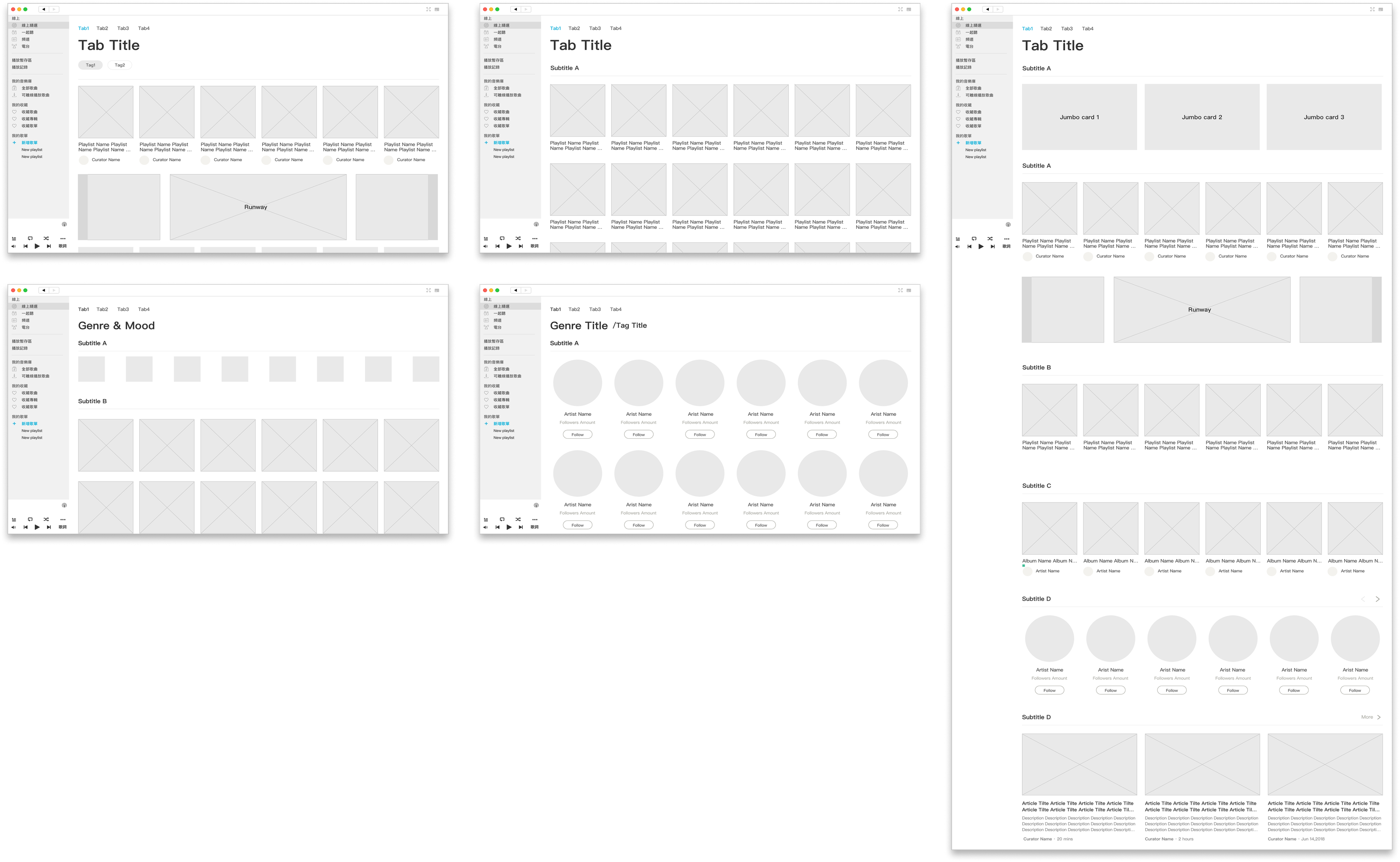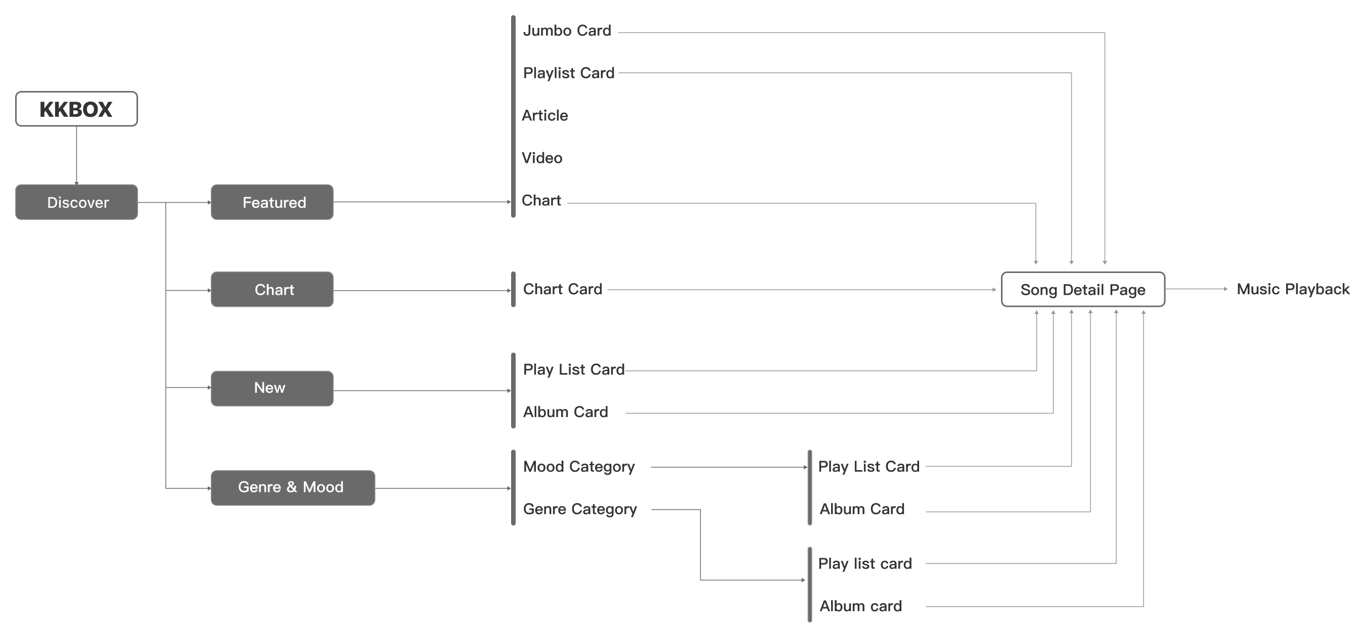 To clarify the structure of the desktop app, I created an information architecture map focusing on how users discover new music, browse playlists and albums, and access detailed song information.