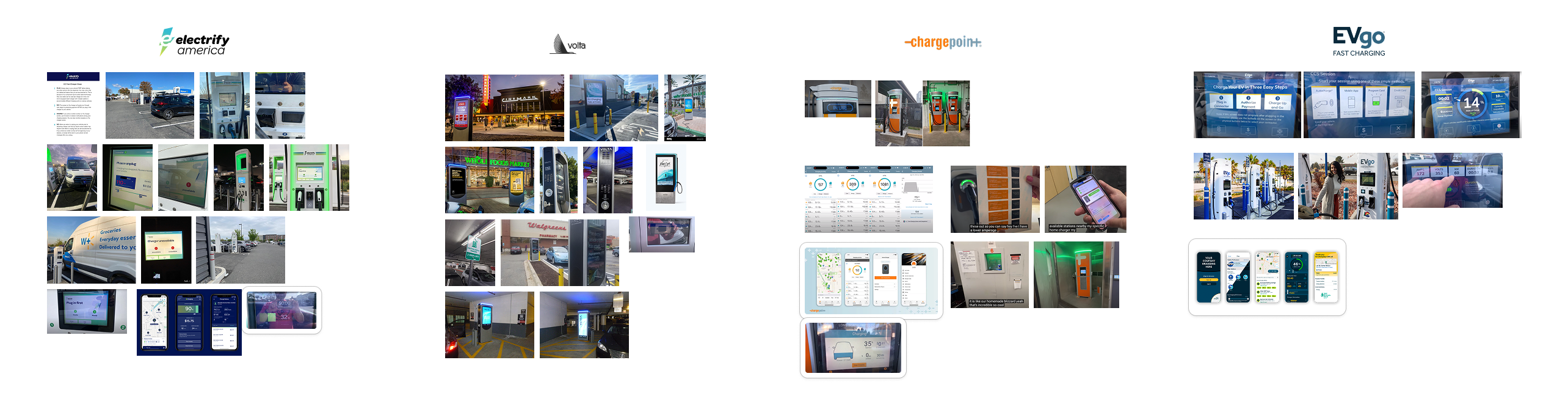 I analyzed several leading U.S. providers, including ChargePoint, Tesla, EVgo, Electrify America, and Blink. I focused on how each product used its on-device interface, the types of user interactions supported, and the assumptions made about user familiarity and context.