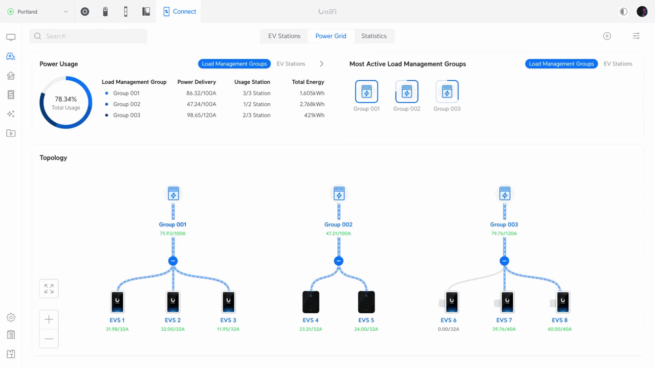 The load management view shows real-time charging activity and visualizes how power is distributed across chargers using a topology-based layout.
